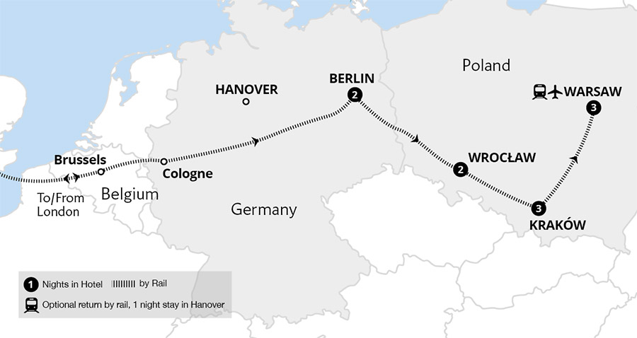 Journeying by rail from London to Warsaw has provided the opportunity to become fully immersed in the culture and history of the cities we have visited. After exploring Berlin, we crossed into Poland where medieval Wrocław charmed with its timeless squares and colourful buildings. Outside its beautiful Old Town, Kraków showed us the emotive recent history of the country, while Warsaw revealed its grand palaces and expansive parklands.