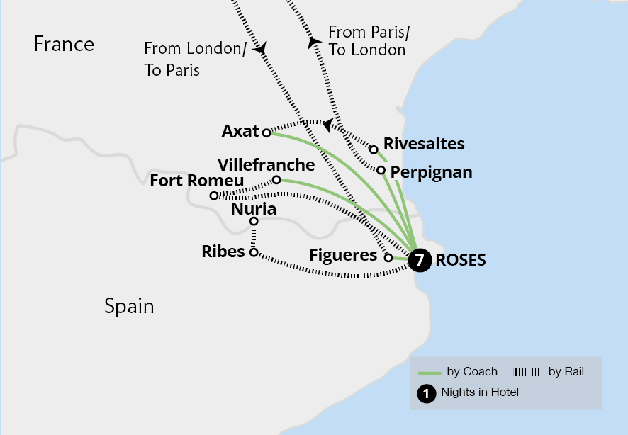 From the coastal town of Roses, discover the glistening Catalan coast and ride into the Pyrenees, taking in the stunning scenery of France and Spain on this relaxing holiday. Journey through peaceful landscapes on the Núria Valley Rack Railway and ride the Little Red Train from Rivesaltes to Axat in France's Pyrenean foothills. Explore...